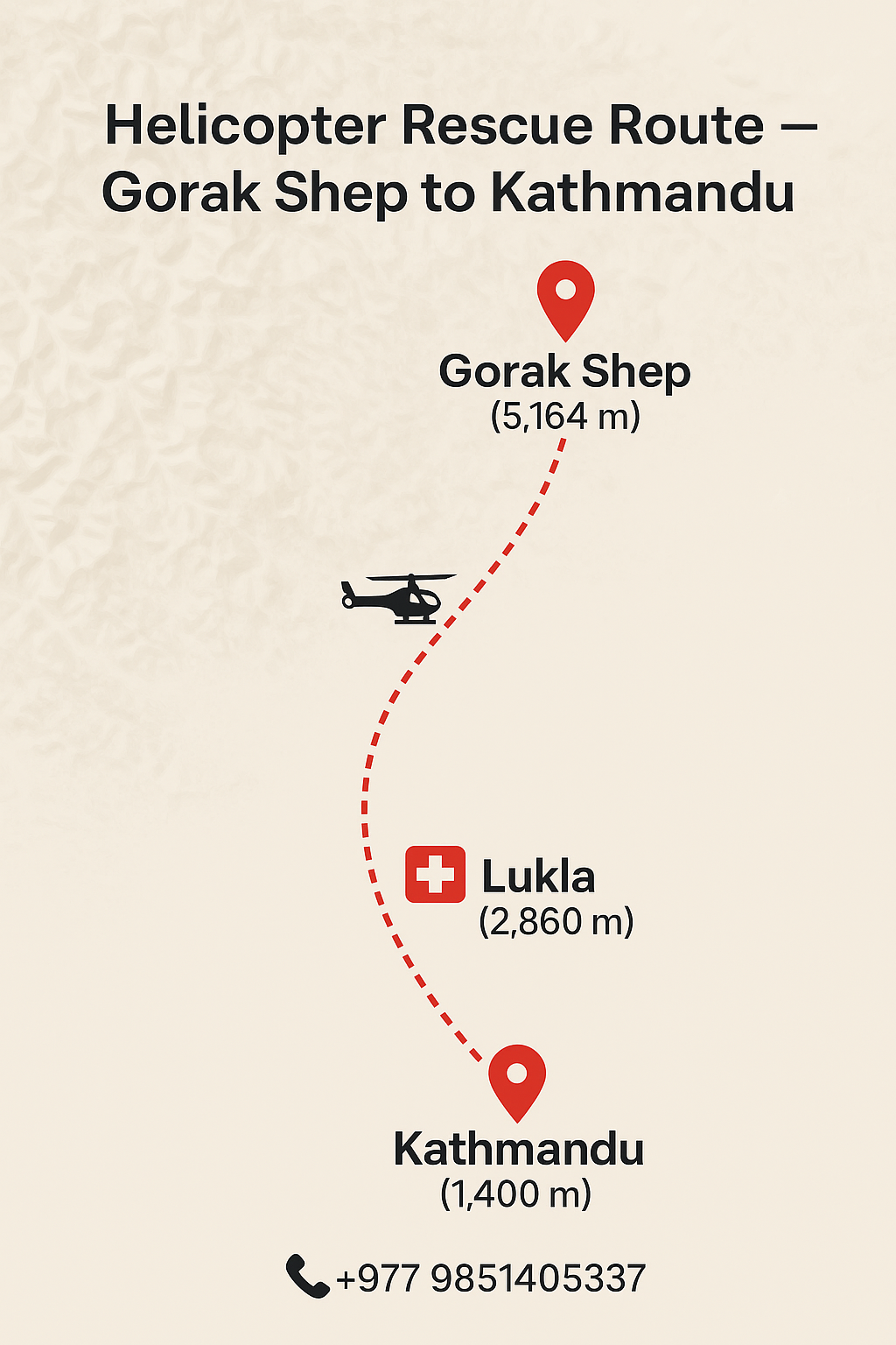 If you or someone in your group needs emergency helicopter rescue from Gorak Shep or anywhere in the Everest region including Namche Bazaar, Dingboche, or other high altitude locations contact Everest Sky Helicopter immediately. We provide 24/7 rapid rescue services with experienced pilots and medical support to ensure your safe and fast evacuation. For prompt assistance, reach out to us via WhatsApp or phone at +977 9851405337. Your safety is our top priority, and we are ready to coordinate rescues anytime, anywhere in the Everest region.