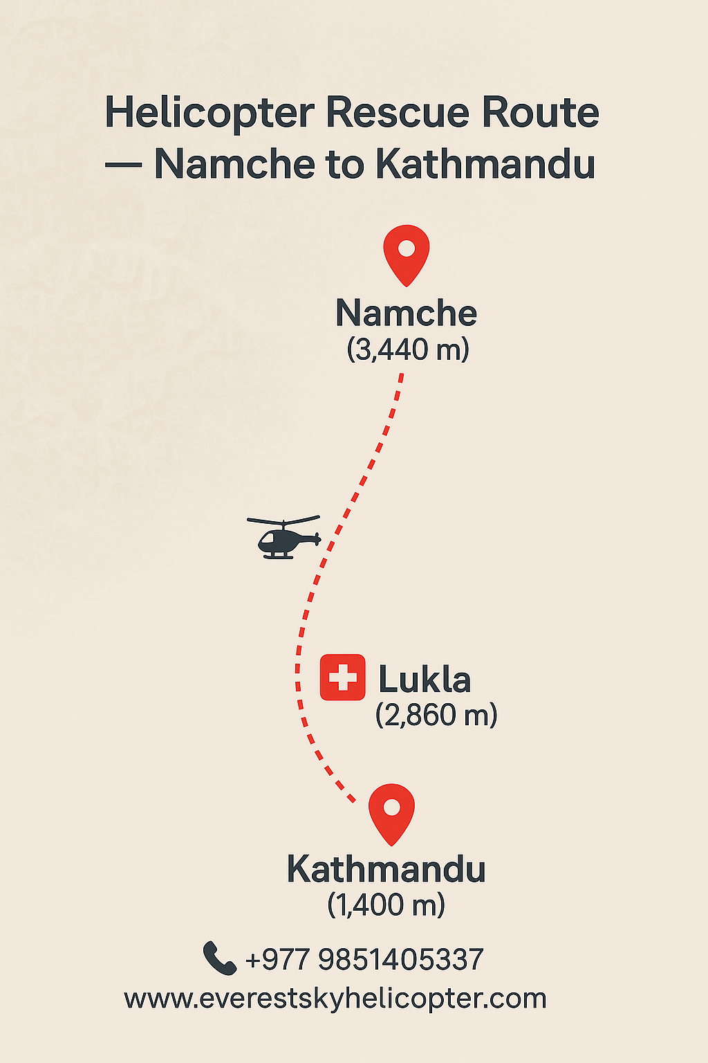 Helicopter Rescue from Namche is a vital emergency service for trekkers facing altitude sickness, injuries, or sudden illness in the Everest region. Everest Sky Helicopter offers fast, reliable evacuation from Namche Bazaar to Kathmandu with medical support and expert coordination. Trekking in the Everest region offers a once in a lifetime experience but high altitudes also come with serious risks. At an elevation of 3,440 meters (11,290 feet), Namche Bazaar is a key point for acclimatization and one of the busiest stops along the trail to Everest Base Camp. However, this also makes it a common location for altitude related complications and trekking emergencies. When time is critical, a quick and safe helicopter evacuation can make all the difference.