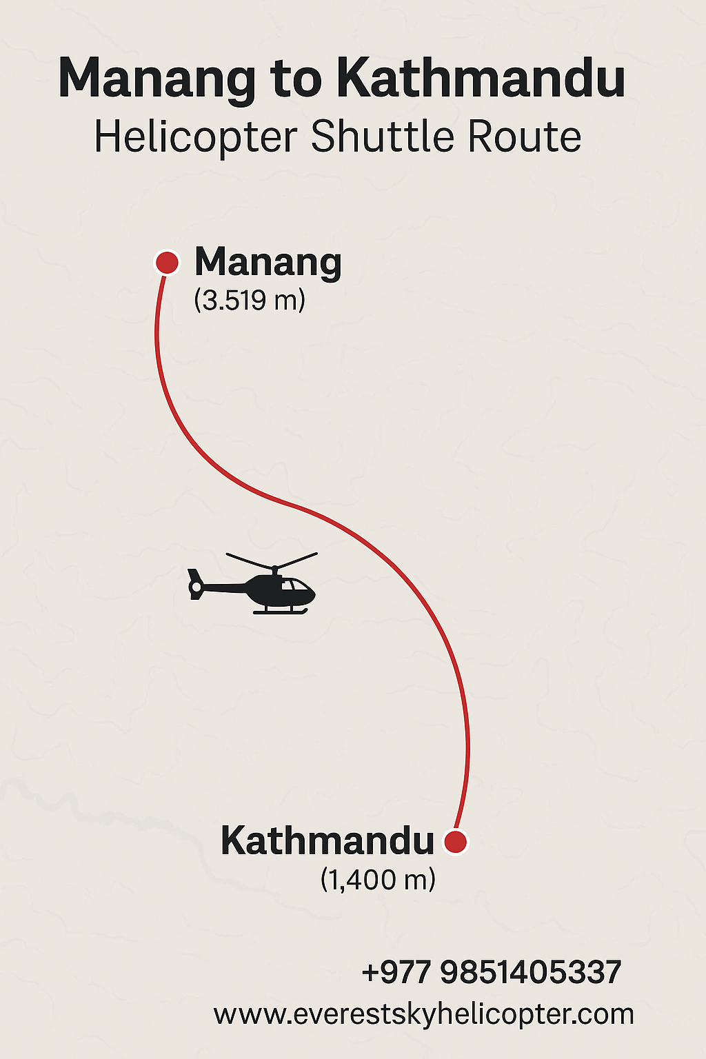 Manang to Kathmandu Helicopter Flight is a quick and scenic aerial escape from the remote Himalayan village of Manang back to the bustling capital city of Kathmandu. Operated by Everest Sky Helicopter, this flight is ideal for trekkers who have completed their journey in the Annapurna region or those facing altitude issues, limited time, or looking for an alternative to a long trek or multi-day road journey.